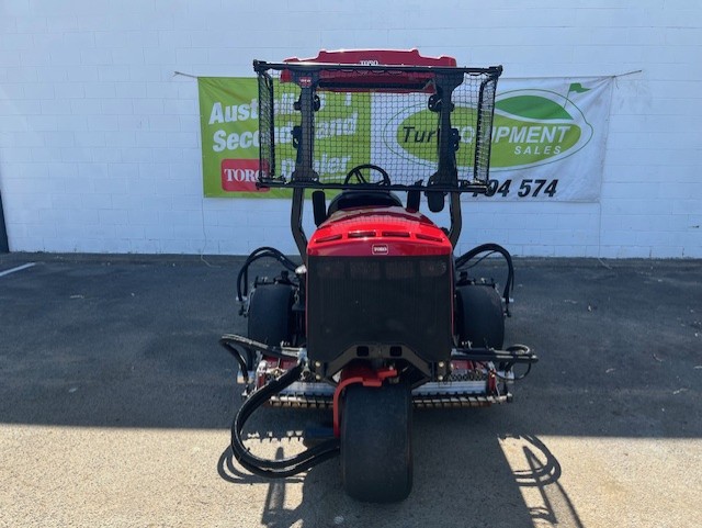 | Controls | Foot operated controls: Forward and reverse traction pedal, mow/transport speed limiter. Hand operated on control panel: Parking brake lever, ignition switch, engine throttle lever, LED headlight switch, on/off switch for cutting units, joystick for cutting unit lift and lower. Other controls: Steering wheel tilt control, reel speed control, backlap engagement lever |