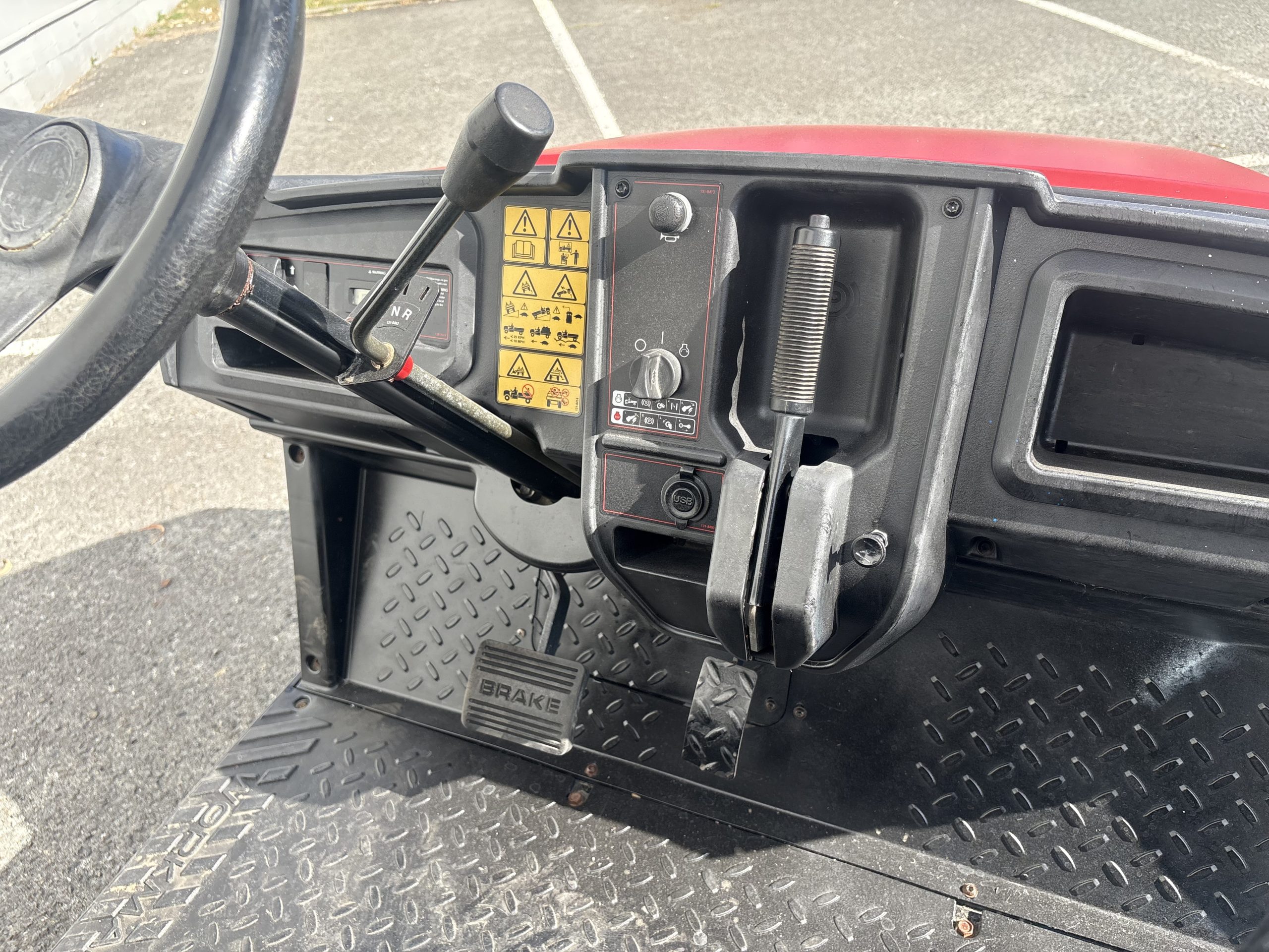 | Gauges/Instrumentation | Hour meter, fuel gauge, USB power port, headlight switch, on/off ignition key switch, gear selector and parking brake lever. Two cup holders, radio holder and three in-dash storage compartments. |